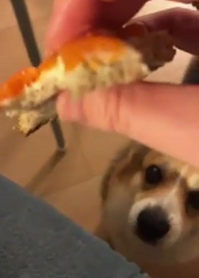 A person is seen holding a piece of salmon and cream cheese on bread in front of a Corgi dog. The dog is on the floor, looking up at the bread. The person lets the dog have the bread. The dog looks up at the camera. The camera moves in closely on the dog's face. The background is a wooden floor and a chair leg. The person is wearing blue jeans.