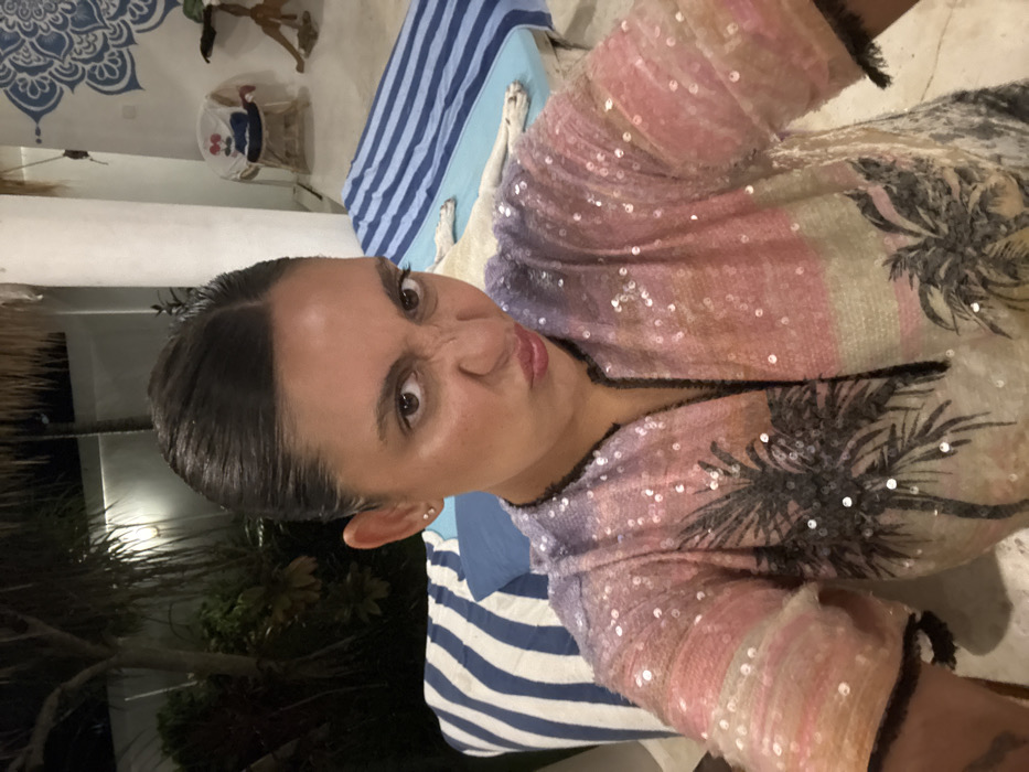 An adult female is captured in a close-up, chest-up selfie within a dimly lit outdoor or semi-outdoor setting in Pecatu, Indonesia. She has dark hair pulled back and directly faces the camera with a playful expression, characterized by a scrunched nose and pursed lips. She wears a short-sleeved, sequined top or dress featuring a pastel gradient from pink to purple, adorned with black silhouette palm tree designs and black trim along the V-neck. In the background, to her left, a blue and white striped cushion is visible. To her right, a light blue and white striped daybed or bench holds a light-colored animal, possibly a cat or dog, lying down. A white structural column and a white wall with a large blue mandala pattern are visible further back, along with tropical foliage and a thatched roof segment, illuminated by an artificial light source.