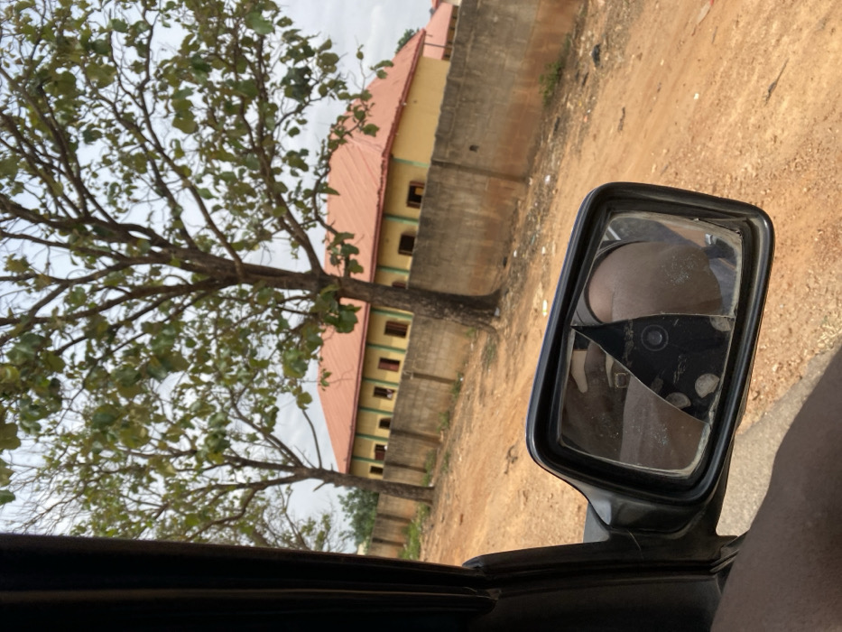 The image displays an outdoor scene in the city of Ibillo, Nigeria, viewed from inside a vehicle. In the foreground, a black, rectangular side-view mirror is positioned in the lower right, its glass fractured. The mirror's reflection shows a segment of a human leg and an interior vehicle component. The immediate environment consists of an unpaved, reddish-brown dirt path running alongside a light-colored concrete block wall. Behind the wall, a long, single-story building with yellow walls and a red corrugated metal roof is visible. The building features multiple open rectangular windows, with at least one faint human figure discernible within a central window opening. Several deciduous trees with green leaves are situated between the wall and the building, partially obscuring the structure. The sky above is overcast.