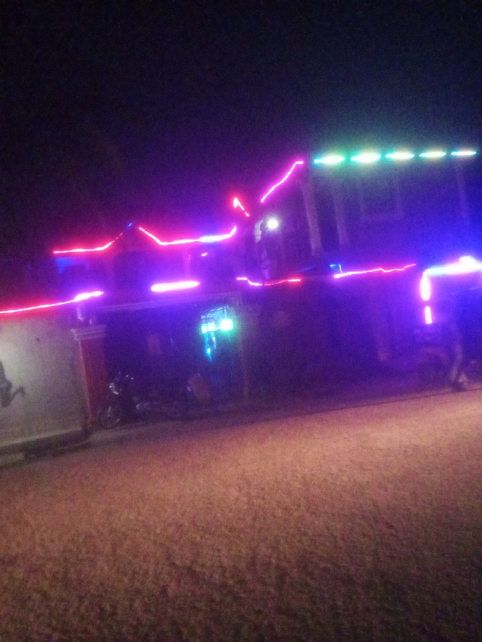 A dark, blurry nighttime scene features a building adorned with colorful LED lights outlining its roof and edges. The lights glow in red, blue, and green. In front of the building, a dark street is visible. A wall stands to the left, and a motorcycle is parked near the building's entrance. The low light conditions and motion blur make details indistinct.