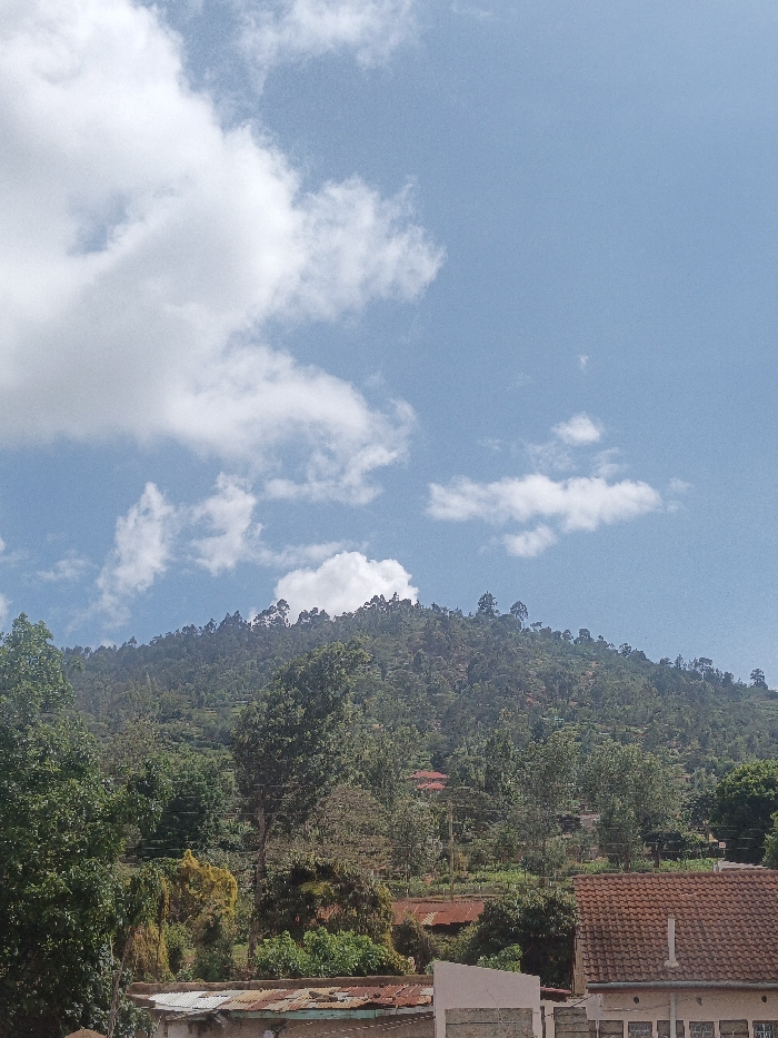 The image displays a daytime, outdoor scene in Machakos, Kenya. The upper two-thirds of the frame consist of a light blue sky with scattered white cumulus clouds. The lower third features a prominent, large hill or small mountain, densely covered in various types of green trees, with some taller, slender trees visible near its summit. Faint indications of terraced cultivation or cleared plots are visible on the hill's slopes. In the immediate foreground, the tops of several structures are visible. To the bottom left, a portion of a building with a rusted or weathered corrugated metal roof is present. Centrally, a light-colored, possibly concrete, wall segment is visible. To the bottom right, a building with a reddish-brown tiled roof and a small chimney or vent structure is partially depicted, with windows visible on its side wall. Further up the hill, nestled among the trees, several smaller structures with reddish roofs are discernible. No individuals are present, and no specific actions or interactions are depicted within the scene.