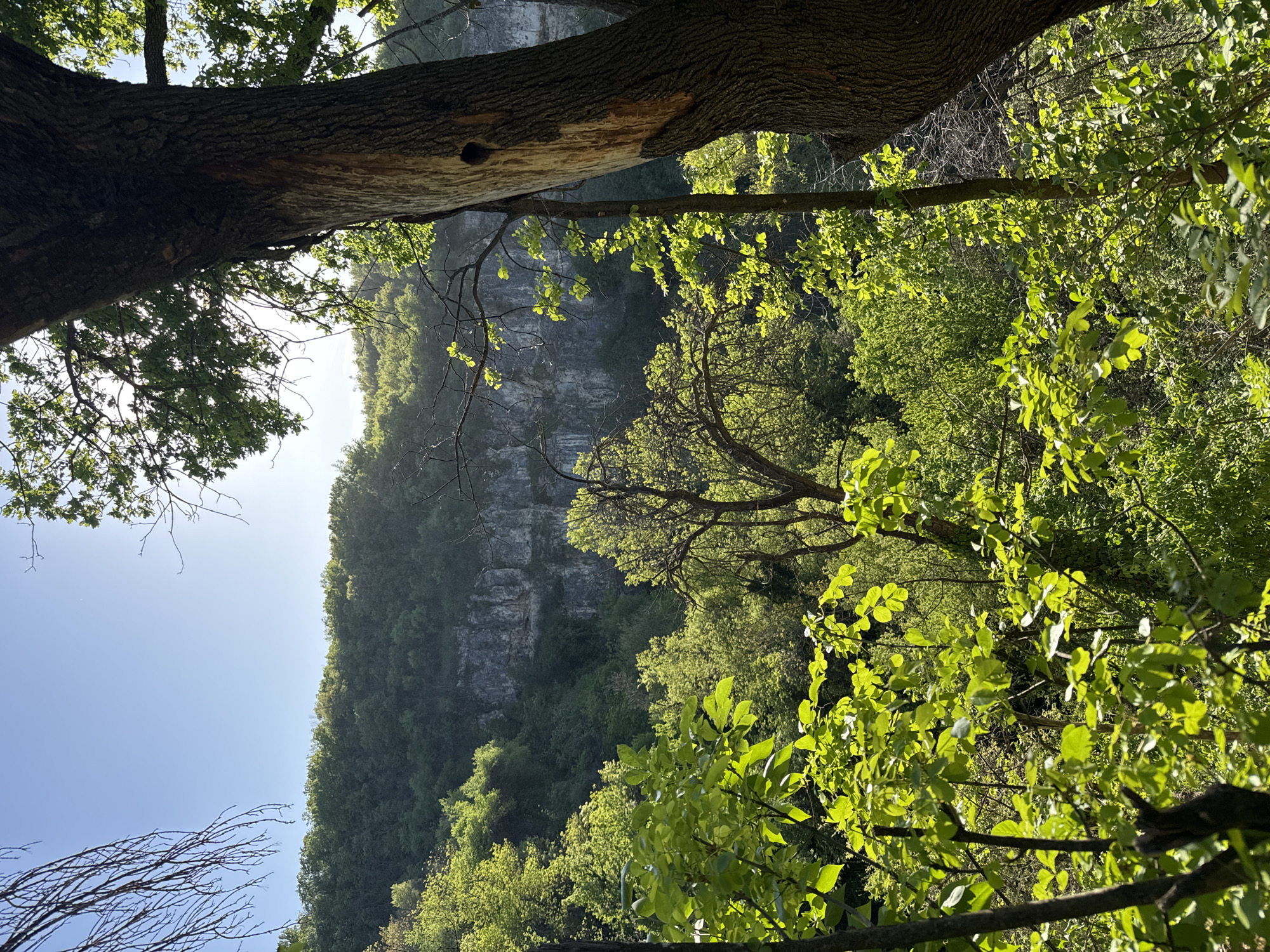 The image depicts a forest scene in Krushuna, Bulgaria. Lush green foliage dominates the foreground and midground. A rocky cliff face is visible in the background. The view is partially framed by the branches and trunks of trees in the foreground and top of the image. The sky is light blue and visible in the upper left.
