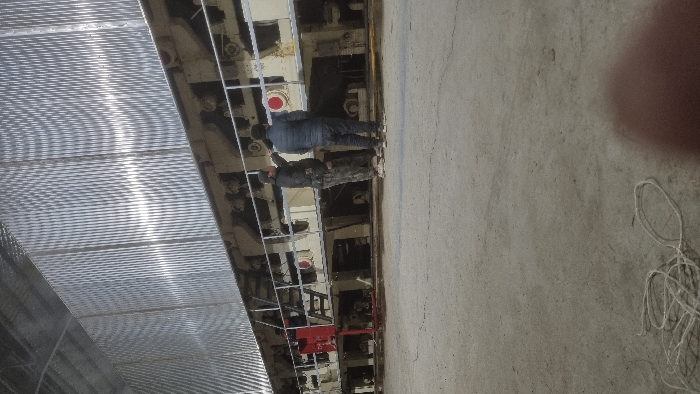 Two individuals are standing near industrial machinery inside a warehouse. One wears a dark jacket, while the other is in camouflage. The machinery appears to be attached to the warehouse's side wall. The warehouse features a corrugated metal roof. The floor is concrete, marked with a crack. A blurred object is present in the upper right corner of the image, alongside a tangled white cord on the floor.