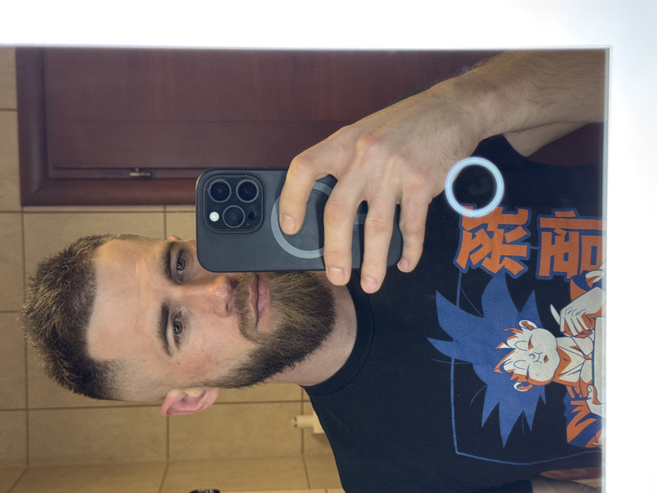 A selfie in a bathroom mirror shows a man with a beard and short, dark hair