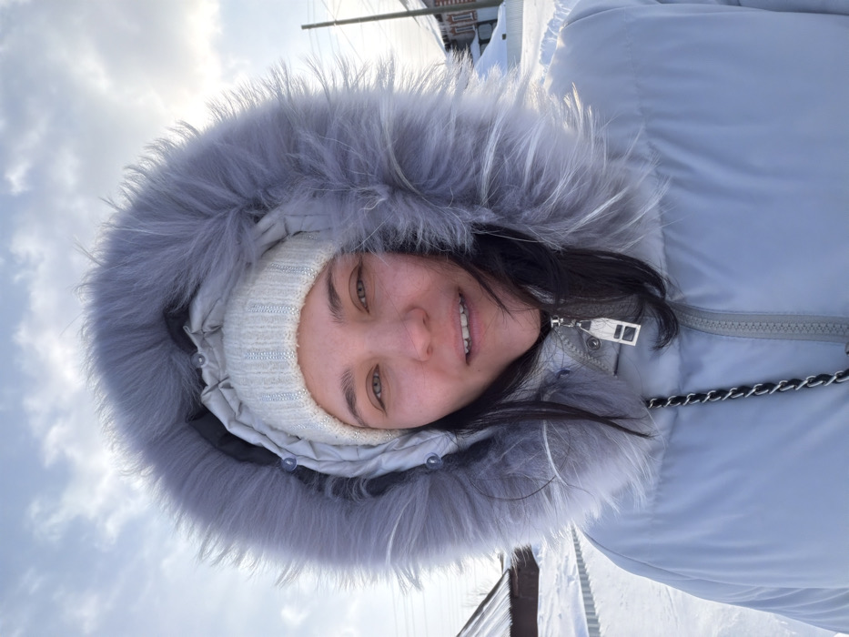 A close-up, chest-up image depicts a female individual outdoors in Alnashi, Russia, during winter