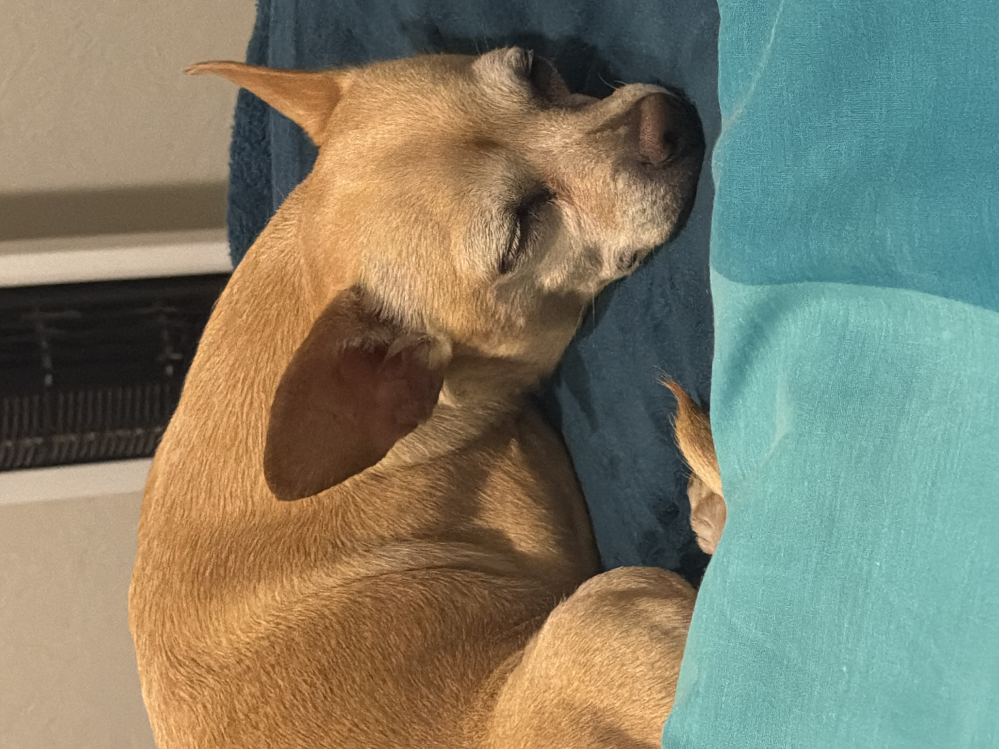 An indoor scene, situated in San Juan Cuautlancingo, Mexico, depicts a light brown, short-haired canine, consistent with a Chihuahua-type breed, in a state of rest. The animal is positioned on its right lateral side, curled, with its eyes closed, indicating sleep. It lies on a dark teal textured blanket. A lighter teal textured blanket partially covers the canine's posterior body and a portion of its tail. One erect ear is visible. The background consists of a light-colored wall and a fragmented dark, vertical object, possibly a household appliance. Illumination appears to be ambient indoor lighting.