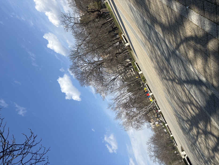 The image captures a tilted, wide view of an empty public square and adjacent park area in Botevgrad, Bulgaria, under a clear blue sky with scattered white cumulus clouds. The foreground and mid-ground consist of a large, expansive paved area composed of rectangular grey and light grey blocks, creating a striped pattern. Long, dark shadows of bare trees are cast diagonally across this paved surface. Along the far edge of the square, a row of light-colored, possibly concrete or stone, public benches is visible. Beyond the benches lies a park area dominated by numerous leafless deciduous trees, indicative of late winter or early spring. Centered within this park, slightly to the left, a large, colorful sign spells out "БОТЕВГРАД" in individual, brightly colored Cyrillic letters (red, orange, yellow, green, blue). Distant buildings are faintly visible through the trees in the background. No individuals, activities, or interactions are present in the scene.