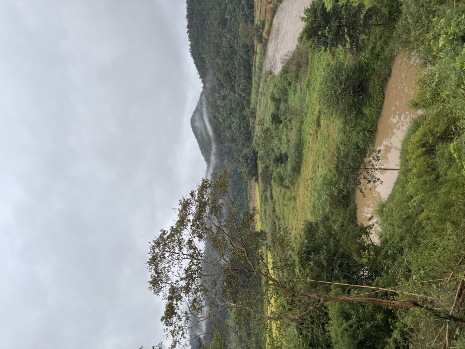 A verdant landscape under a gray sky features a river winding through lush vegetation. A forested mountain rises in the background, partially obscured by mist. In the foreground, a bare tree frames the scene. The river appears muddy, suggesting recent rainfall. The atmosphere is serene and slightly overcast.