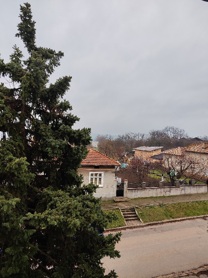 An elevated view captures a residential scene in Loznitsa, Bulgaria, under an overcast sky