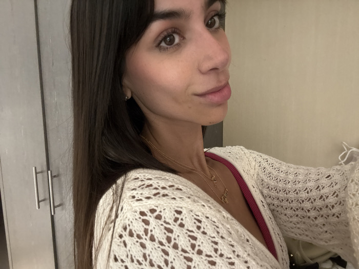 A woman with long, straight, dark hair and bangs is looking at the camera. She has brown eyes, and is wearing a white lace sweater over a maroon top. She is wearing two gold necklaces. Behind her is a gray cabinet with silver handles and a beige wall.