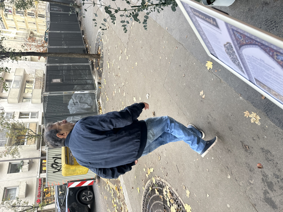 This image captures an urban street scene near the Guy Moquet metro station in Paris, France, during what appears to be autumn. The primary subject is an adult male, viewed from a three-quarter rear perspective, walking left across a paved sidewalk. He wears a dark blue bomber jacket, light blue jeans, and dark casual shoes, with his left foot elevated mid-stride. He has dark hair and wears glasses, his head slightly turned to his right. The sidewalk is visibly damp and strewn with fallen yellow and brown leaves. A round metal manhole cover is present on the left side of the sidewalk. In the immediate foreground on the right, a white-framed display board featuring decorative patterns and text, possibly a menu, is angled towards the viewer, with a small green plant in a white pot next to it. In the mid-ground, behind the man, a black car is partially visible on the street, adjacent to a yellow utility box with graffiti. Beyond this, a long stretch of dark grey metal construction barriers, interspersed with red and white striped warning panels, delineates a worksite. Behind the barriers, light-colored multi-story apartment buildings with typical Parisian architectural elements are visible, one displaying a red "Guy Moquet" sign. Several slender trees are planted along the sidewalk within tree grates. The sky is overcast.