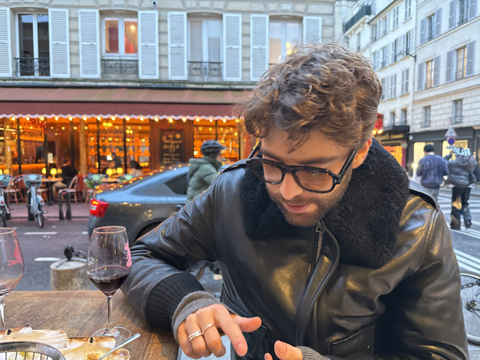 A man sits at an outdoor cafe. He has curly brown hair, a beard, and glasses, and wears a black leather jacket with a fur collar. He looks down at a phone in his hand. A half-empty glass of red wine and a plate of food are on the table. Behind him is a building with white shutters and an awning with lights. A car and pedestrians are visible on the street.