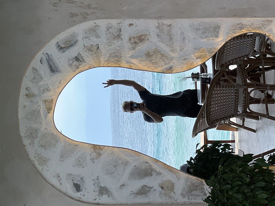 An indoor-outdoor scene at a coastal establishment in Batununggul, Indonesia, features a male subject taking a selfie through an arched, rustic stone-textured opening