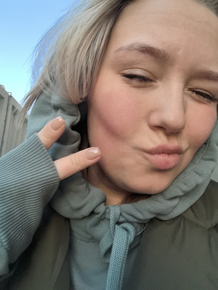 A female individual is depicted in a close-up portrait, oriented slightly to the left. She has light-colored hair, visible as blonde strands framing her face. Her complexion is fair, with pronounced rosy blush on her cheeks. Her eyes are closed in a squinting gesture, and her lips are pursed into a "kissing" expression. She wears a teal-colored hooded sweatshirt, with the hood partially up and visible drawstrings at the neckline. A darker, possibly olive-green, outer garment is visible beneath the hoodie. Her left hand is raised, with the index and middle fingers extended in a V-sign gesture near her left cheek. Her fingernails have a light, opaque polish. The background is out of focus, revealing a clear, light blue sky in the upper left and blurred, light-grey rectilinear structures, consistent with building elements or containers, to her left. The specific location within Krasnoyarsk, Russia, cannot be determined from the visual evidence presented.