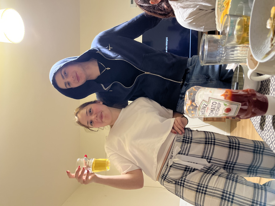 Two young people pose indoors, one in a blue hoodie and jeans, the other in a white shirt and plaid pajama pants, holding a glass with a yellow liquid. A bottle of Heinz ketchup sits on the table beside them. The scene is casual, possibly a home setting with glasses, dishes, and a television in the background. A light fixture is visible on the ceiling. The photo appears to be taken at an angle.