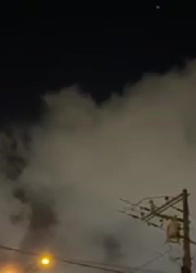 nighttime view of a sky partly covered with clouds. A bright light, possibly a star or planet, is visible above the clouds. In the foreground, there is a utility pole with wires and a transformer. A street light is also visible, casting a warm glow. The roof of a building is partially visible at the bottom right corner of the frame.