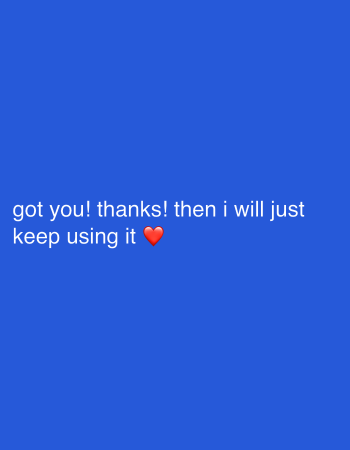 white text on a solid blue background. The text reads "got you! thanks! then i will just keep using it ❤️". There is a red heart emoji at the end of the sentence. The image provides no information about the city of Bjeliši, Montenegro.
