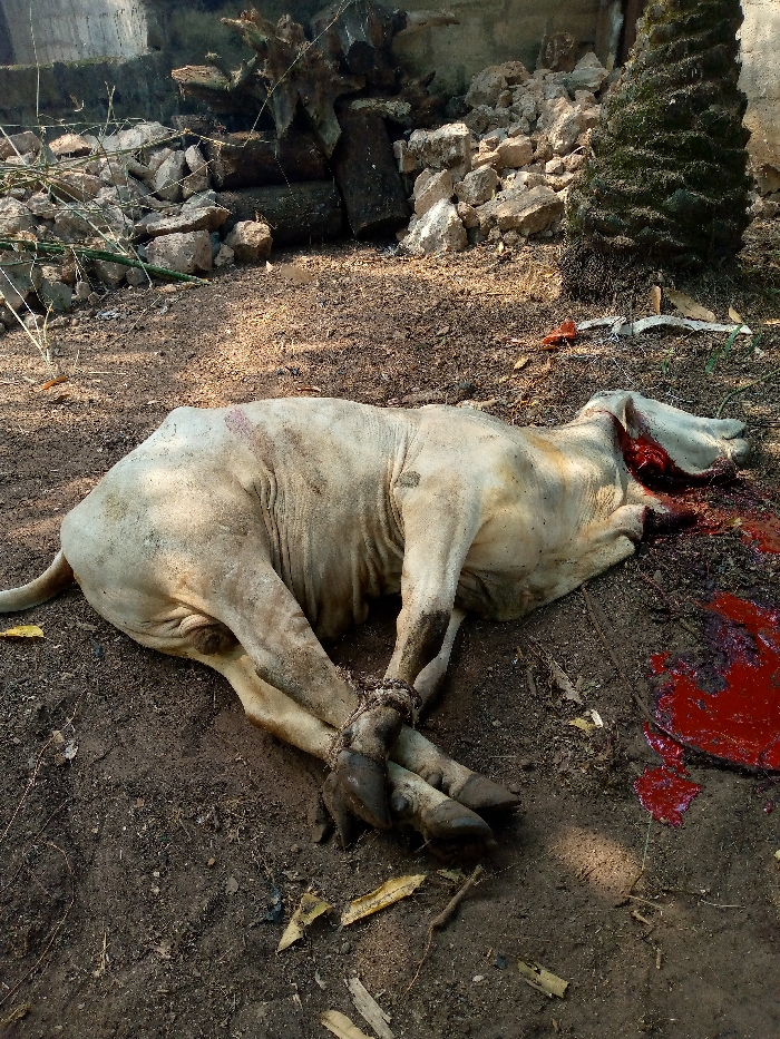 A slain white cow lies on brown dirt, its legs bound together with rope
