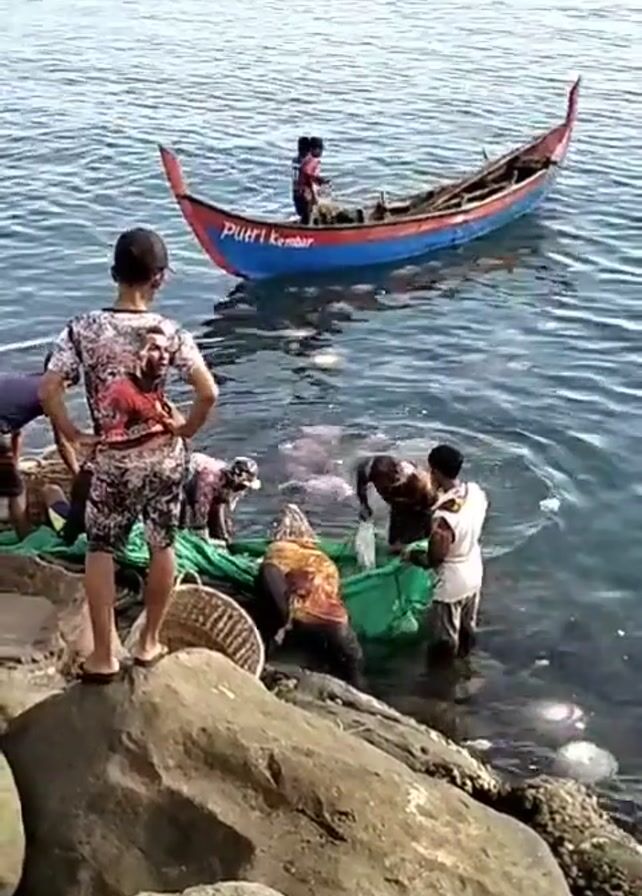 A group of people are standing and working in shallow water near a rocky shoreline, apparently handling a large fishing net. A small boat labeled "Putri Kembar" is positioned further out in the water with two people on board. The people near the shore appear to be pulling something from the water, possibly caught in the net. A young person stands on a rock in the foreground, observing the activity. The scene takes place on a sunny day by the sea.