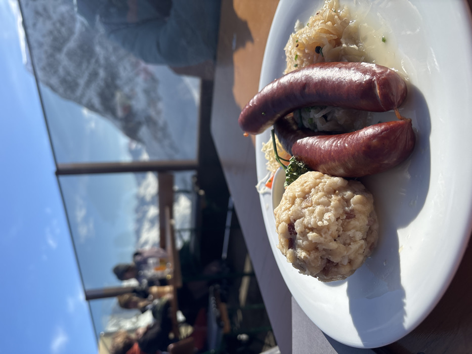- "The image depicts a meal served on an outdoor restaurant terrace in Lech, Austria, overlooking a snowy alpine mountain range under a clear blue sky" by FM-Wt2QG3, licensed under CC BY 4.0
