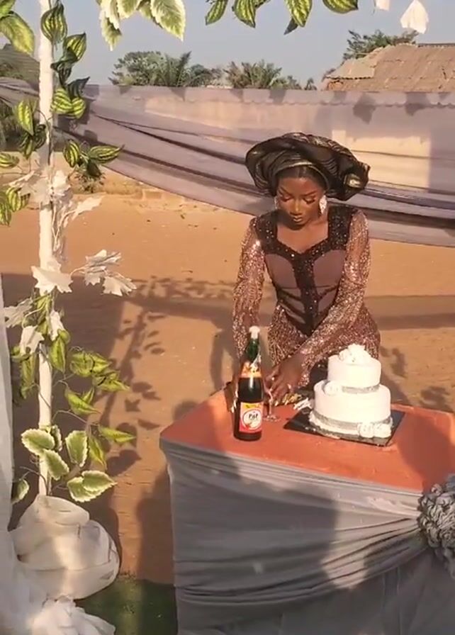 A woman in a brown sequined dress and headwrap stands at a table adorned with an orange tablecloth and gray drapery. The table holds a three-tiered white cake, a bottle of malt drink, a plate of small food items, and a wine glass. She pours the malt drink into the wine glass. The scene is outdoors, with artificial greenery framing the shot and a fence in the background. The ground appears sandy or dirt-covered. The lighting suggests it is daytime.