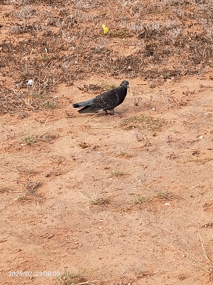 - "The image, captured on 2026/02/23 at 08:09 in Juan Griego, Venezuela, depicts a solitary dark-plumaged pigeon standing on dry, reddish-brown earth" by FM-rXFZZ2, licensed under CC BY 4.0
