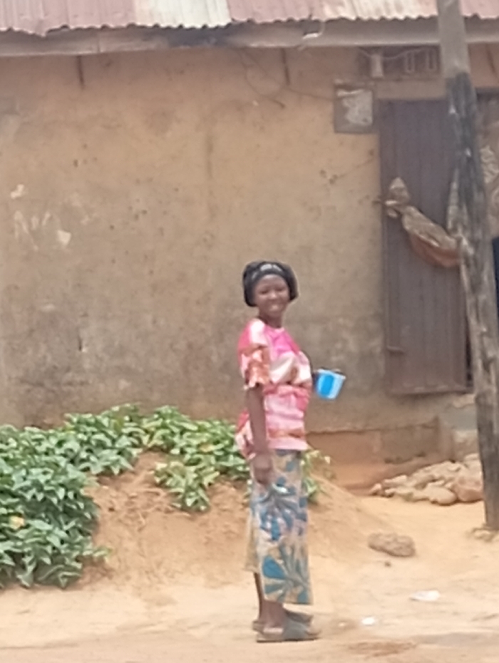 This image displays an outdoor scene in Yelwa, Nigeria. A single individual, identified as female, stands centrally on an unpaved dirt surface. She faces forward with a slight smile, wearing a dark head covering, a short-sleeved top patterned in pink, white, and orange, and a long skirt or wrapper patterned in blue, green, and white. Open-toed sandals are visible on her feet. In her right hand, she holds a blue plastic cup. The background features a light brown building with a corrugated metal roof, partially visible at the top. A dark wooden door or shutter is situated on the right side of the building's facade. To the left of the individual, a mound of earth supports a patch of green leafy vegetation. Scattered rocks and a dark vertical post are visible on the right side of the frame.