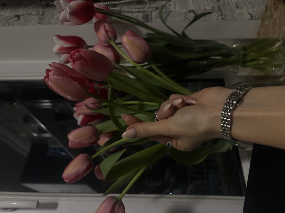 An indoor scene features a human hand, positioned centrally, performing a "finger heart" gesture. The hand is manicured with light pink/nude nail polish. A silver-toned ring with black beads is worn on the index finger, and a plain silver-toned ring is on the thumb. A silver-toned metal link bracelet with gold-toned accents is on the wrist. In the background, a large arrangement of fresh tulips is visible, predominantly in shades of pink, with some displaying white edges. The tulips are arranged in clear glass vases, showing prominent green stems and leaves. To the left, a dark window or glass panel reflects an interior space. To the right, a wall covered in patterned wallpaper, resembling newsprint, is present, with a white beaded chain hanging against it. The lighting is dim, suggesting evening or nighttime conditions. The specific location within the city of Yerevan, Armenia, is not discernible from the provided visual information.