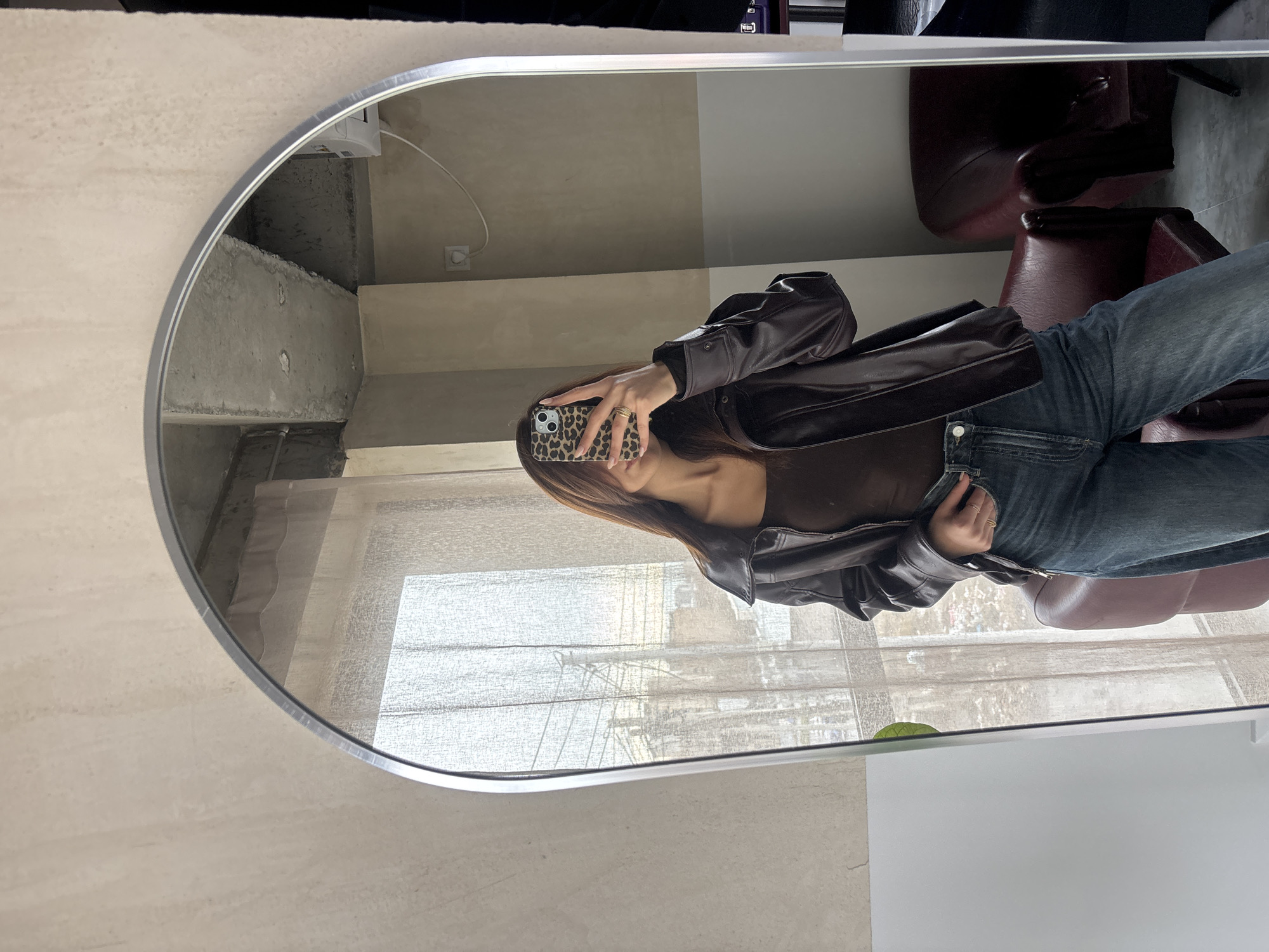 reflection in a rounded mirror. A woman is taking a selfie using a phone with a leopard print case. She is wearing a brown leather jacket, a brown top, and blue jeans. The mirror reflects a view from a window, showing buildings and possibly indicating the city of Yerevan, Armenia. The background also includes chairs.