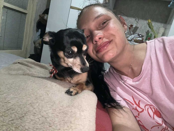 An adult female and a small dog are depicted in an interior room, identified as being in Sofia, Bulgaria. The perspective suggests a selfie. The female subject, positioned on the right, has dark hair pulled back and fair skin with visible blemishes. Her lips are closed with an upward curve, and her eyes are open. She wears a light pink short-sleeved t-shirt with a red graphic design on the chest and a thin gold chain necklace. Her head is tilted and pressed against the dog's side. The dog, a small breed resembling a Chihuahua or Miniature Pinscher, features black fur on its head and back, with tan fur on its muzzle, chest, and legs. It wears a red and white patterned bandanna or bow around its neck. The dog's gaze is directed downward and to the right of the frame. Both subjects are resting on a light beige, textured blanket. In the background to the left, a window with horizontal blinds is visible. To the right background, a shelf or surface holds various items, including a tall green cactus-like plant, a green can with a red star emblem (resembling a Heineken beer can), a white cylindrical object, and other indistinct items. The overall lighting suggests an indoor setting, possibly evening or night, with artificial light sources.