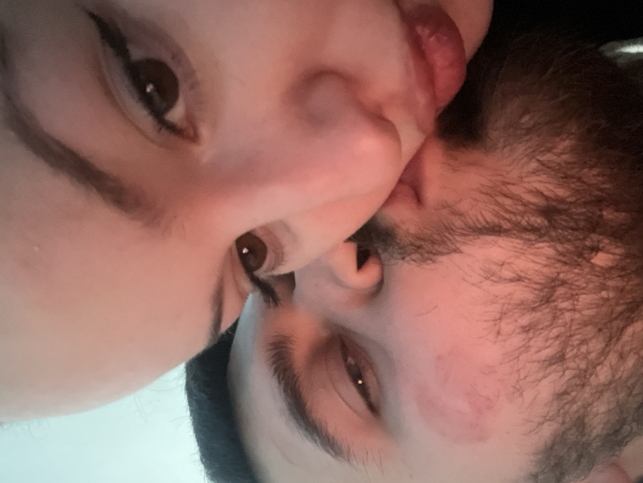 The image depicts a close-up, vertically oriented scene featuring two individuals in intimate physical contact, illuminated by strong red-orange ambient light. A female subject occupies the right foreground, with her right eye, enhanced by dark eyeliner, clearly visible alongside a portion of her forehead, nose, and lips. Her lips appear to be pressed against the lower facial area of the second subject. This second subject, a male characterized by dark hair and a dark beard/stubble, is positioned on the left, partially obscured by the female. His left eye is visible and partially open. A distinct red lipstick mark is present on his left cheek. The background is uniformly light and out of focus, consistent with an indoor setting. No specific objects beyond the subjects are discernible. The image contains no visual elements to determine a location within the city of Sliven, Bulgaria.