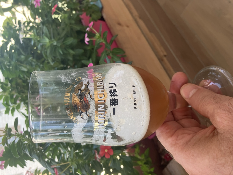 A right hand holds a stemmed beer glass containing a light amber liquid with a white foam head. The glass is branded with a gold and black "KIRIN ICHIBAN" logo featuring a winged creature, Japanese characters, and "FIRST PRESS" text. Foam residue clings to the interior of the glass. The background consists of vibrant green foliage with small pink flowers, contained within a pink planter. A horizontal wooden surface is visible to the right. The scene is outdoors, likely on a balcony or patio, in the city of Givatayim, Israel.