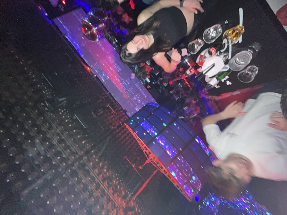 The image depicts an indoor nightclub scene in Pamporovo, Bulgaria, characterized by low light and vibrant, dynamic club lighting predominantly in blue, red, and purple hues. The ceiling is densely covered with numerous small, reflective fixtures resembling miniature disco balls. To the left, a multi-panelled structure, possibly a DJ booth or performance stage, displays animated, colorful light patterns. A large screen or wall in the background features abstract projections in pink, purple, and red. A spherical disco ball is suspended in the upper right background, reflecting light. In the foreground, a female subject with dark hair, wearing a black sleeveless crop top and dark pants, stands behind a reflective black table, looking towards the left. A watch is visible on her left wrist, and she holds an indistinct object in her right hand. To her left, partially blurred due to motion, a male subject in a white t-shirt is visible, suggesting movement consistent with dancing. The table is cluttered with several clear drinking glasses, some containing an amber liquid, along with various empty bottles (including a green glass bottle and soda bottles), black straws, and scattered white material, possibly confetti or discarded napkins. Numerous blurred figures are visible in the background, indicating a crowd of people. The floor also contains scattered white debris.