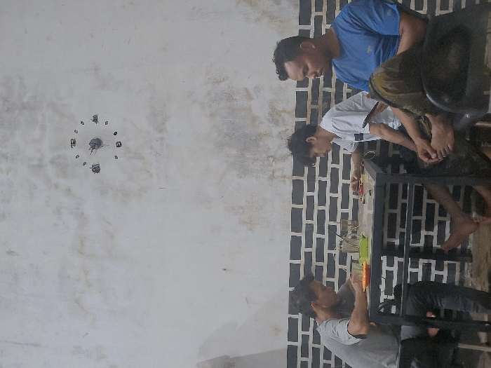 Three men are gathered around a metal-framed table, seemingly engaged in a project. One man, wearing a blue shirt, sits while observing the others. Another, in a white shirt, leans over the table, focusing on something within reach. The third man, wearing a gray shirt, stands at the edge of the table, also participating in the activity. The room has a white wall with a decorative clock-like design on it and a brick-patterned wall section.