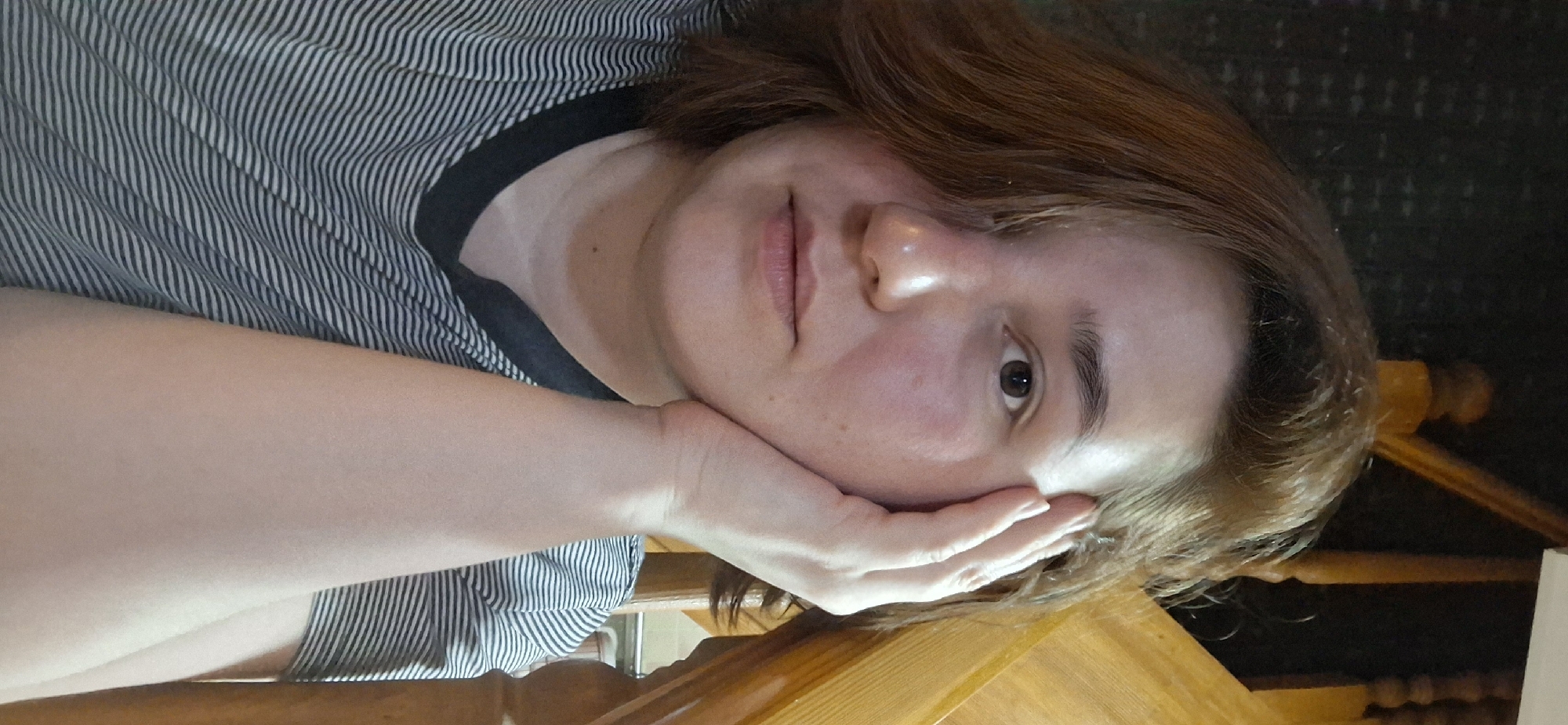 A woman with reddish-brown hair is lying on a wooden surface, resting her face on her hand. She is wearing a striped shirt. The setting appears to be indoors. The exact location in Chaikovsky, Russia, cannot be determined from the image.