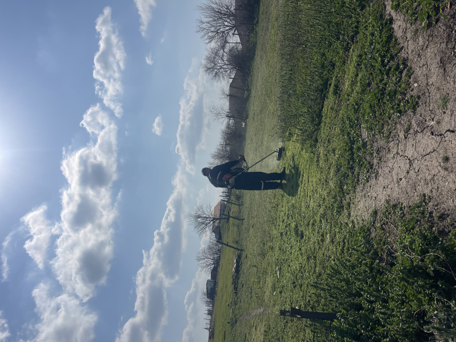 The image displays an outdoor scene in Bulgarovo, Bulgaria, under a clear blue sky with scattered white cumulus clouds. A lone adult male is visible from behind, positioned in the middle-right ground, actively operating a gasoline-powered string trimmer. He is wearing dark work trousers with a lighter stripe near the ankles and a dark top, supported by a grey and orange shoulder harness for the trimmer. The trimmer's head is in motion, cutting green grass, and a faint mist or dust plume is visible around it. To the man's left, a section of grass has already been mown, appearing shorter and more uniform. Taller, unmown grass and weeds are present in the foreground and to his right. A dry, cracked dirt path traverses the lower half of the image, leading towards the man. The surrounding environment consists of gently sloping terrain covered in green vegetation, with multiple bare deciduous trees in the mid-ground and background. Several weathered wooden fence posts are visible, particularly along the left side. In the distance, on the horizon, multiple residential structures with visible roofs, including one with an orange-red tiled roof, are partially obscured by the trees. The sun is a bright glare in the upper right sky, casting distinct shadows.