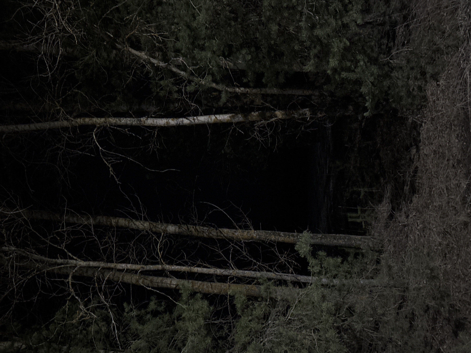 The image depicts a night scene in what appears to be a wooded area. Several fallen birch trees with visible white bark lie horizontally across the frame. Evergreen trees and bare branches surround the birch trees, obscuring the background. The darkness is significant, with limited visibility of the environment. The location, Rusalevka, Russia, is based on additional information provided and is not visually discernible from the image itself. No people or specific actions are observable.