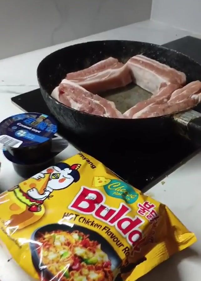 A video shows an overhead shot of a kitchen counter. On the counter is a package of Buldak Hot Chicken Flavor Ramen Cheese flavor, a container of what appears to be a dairy product, and a dark skillet. In the skillet are four rectangular pieces of pork belly, arranged in a square shape. The skillet sits on a black stovetop.