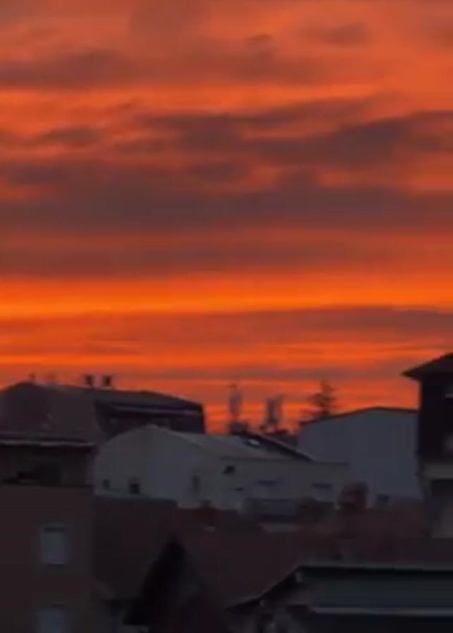 - "The video pans across an urban skyline, with buildings of various sizes and colors silhouetted against a vibrant, fiery orange and red sky" by FM-7mF7g2, licensed under CC BY 4.0