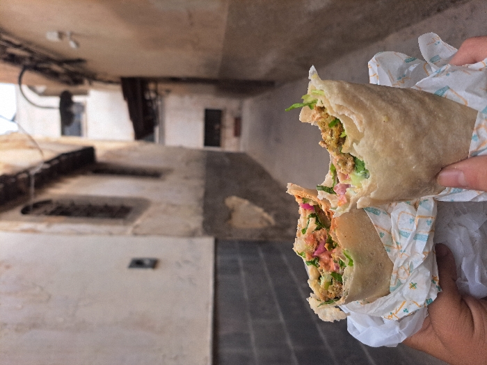 - "The image depicts two hands holding a cut, ready-to-eat Middle Eastern-style wrap, likely a falafel sandwich, in a narrow alleyway within the city of Damascus, Syria" by FM-F5kpk1, licensed under CC BY 4.0