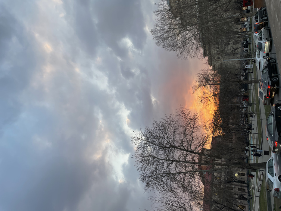 The image depicts an urban park and street scene in Yerevan, Armenia, observed at dusk. The sky is largely overcast with dense, multi-layered clouds displaying shades of gray and pale blue, with a prominent band of vibrant orange and red hues on the western horizon, indicative of sunset. Numerous leafless deciduous trees with intricate branch patterns dominate the middle ground, silhouetted against the sky. Below the trees, a public park area features paved pathways, green spaces, and benches, occupied by approximately 15-20 pedestrians who are either walking or standing. In the background, multi-story buildings with classical architectural elements and reddish-brown roofs are partially visible through the tree line. The foreground contains a paved street with a line of parked passenger vehicles, including silver, black, and white sedans and hatchbacks, positioned along the curb. No specific interactions or detailed actions are clearly discernible among the distant figures.