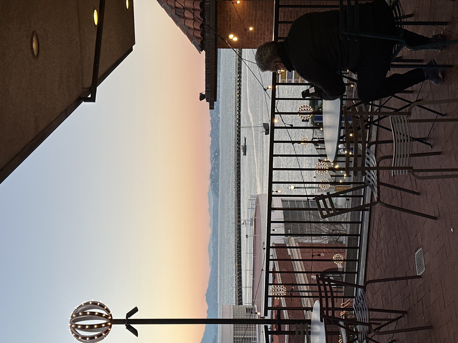 - "A sunset view from a patio with a man leaning over a table" by FM-2Bjlr1, licensed under CC BY 4.0