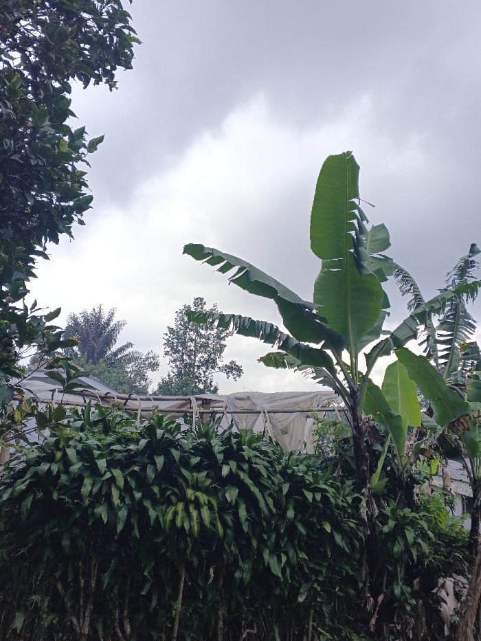 This image depicts a lush, verdant outdoor scene in Lokossa, Benin, under an overcast sky. The upper portion of the frame is dominated by a grey, cloudy sky. In the upper left quadrant, dark green foliage from a tree canopy partially obscures the sky. The mid-ground features a prominent, dense line of broad-leafed, dark green tropical plants, resembling a hedge. To the right of this hedge, several banana plants with large, green, partially torn leaves are visible, with one tall banana plant standing prominently. In the background, behind the dense vegetation, a light-colored structure, possibly a makeshift shelter or a greenhouse, is visible. This structure is covered with light-colored tarpaulins or fabric and supported by a framework appearing to be made of wood or bamboo. Further in the distant background, additional trees with varied foliage, including a palm-like tree on the left, are present. No individuals, animals, or explicit actions are observed in the scene.