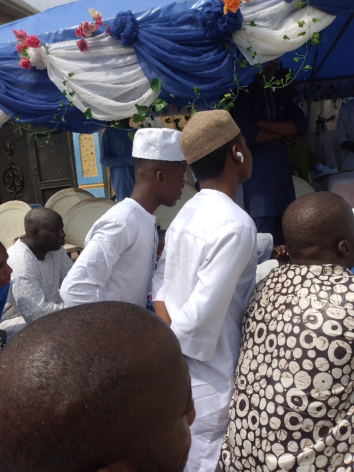The scene is an outdoor gathering in Ijoko, Nigeria, beneath a blue and white canopy decorated with draped fabric, artificial pink and white flowers, and green vines. In the mid-ground, two young males stand. The male on the left wears a white long-sleeved tunic and a white skullcap, facing right. The male to his right wears a white long-sleeved tunic, a brown knitted skullcap, and a white earbud in his right ear, also facing right. To their left, an adult male in a light-colored patterned garment is visible from the chest up, looking left. A blurred, bald head occupies the immediate foreground, with the back of another individual in a brown and white patterned garment visible to its right. In the background, white plastic chairs are present, and a building with a light blue door frame is partially visible. Under the canopy, a male in a dark blue tunic stands with crossed arms.