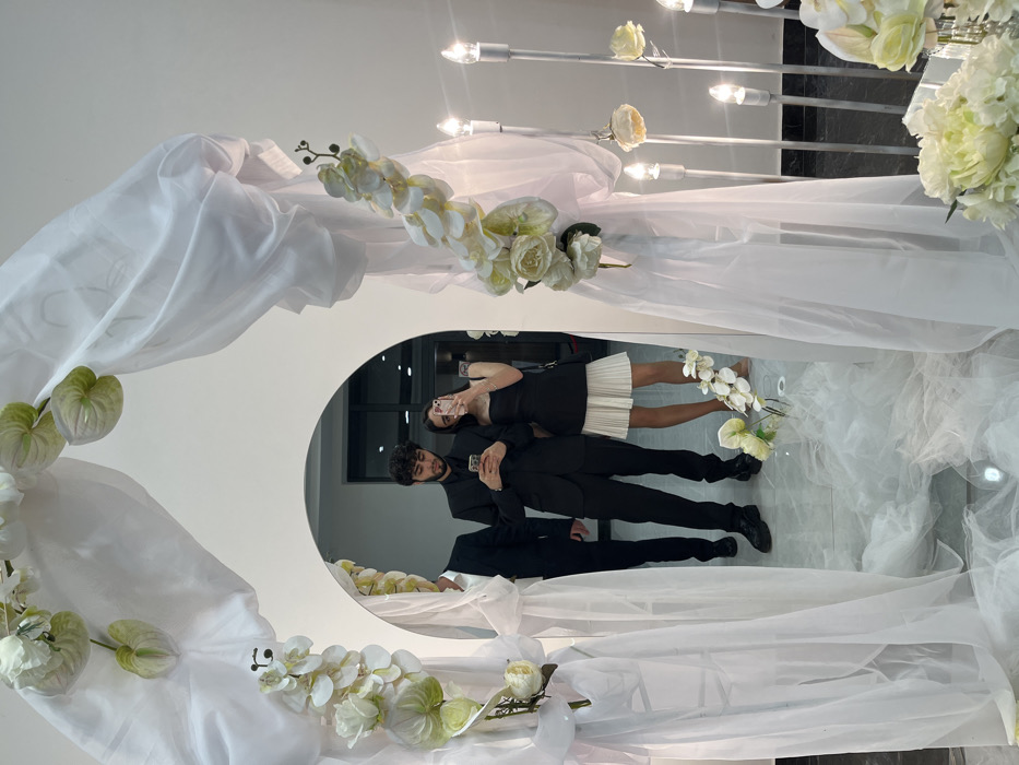 The image displays an indoor scene in Hrazdan, Armenia, centered on a large, white-framed mirror reflecting three individuals. The mirror is positioned behind a decorative white arch draped with sheer white fabric and adorned with artificial white and light green flowers, including orchids, calla lilies, and roses. White tulle fabric is loosely spread on the floor directly beneath the arch. In the mirror's reflection, a male with dark, curly hair and a beard stands centrally, wearing a black suit and a dark shirt. He is looking down at a smartphone held in both hands. To his right, a female with dark hair is visible, wearing a black strapless top and a white pleated skirt. She holds a smartphone to her face with both hands, positioned as if taking a photograph or video. Her feet are bare. Partially visible to the male's left is a third individual wearing a dark suit jacket and a white shirt. To the right of the decorative arch in the foreground, a portion of a multi-tiered vertical lighting fixture with exposed bulbs is visible, also decorated with white flowers. The reflected background reveals a light-colored wall and a dark rectangular feature, possibly a doorway or window.