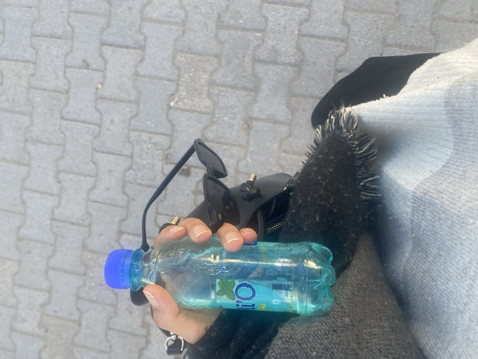 The image displays a close-up, top-down view of a person's lap or arm area, situated on a pedestrian walkway in Monastir, Tunisia. A light-skinned hand, featuring natural fingernails and a gold-colored ring on the ring finger, firmly grips a clear plastic bottle. The bottle has a blue cap, contains a light blue liquid, and bears a label with "O'LI" text and a green mint leaf graphic, indicative of a Tunisian mint-flavored beverage. Adjacent to the bottle, a pair of black, pointed-frame sunglasses rests on a dark-colored bag with visible gold hardware. The foreground includes dark, textured fabric with a frayed edge, layered over a lighter, possibly patterned fabric. The background consists of grey interlocking concrete pavers, characteristic of a sidewalk or public path.