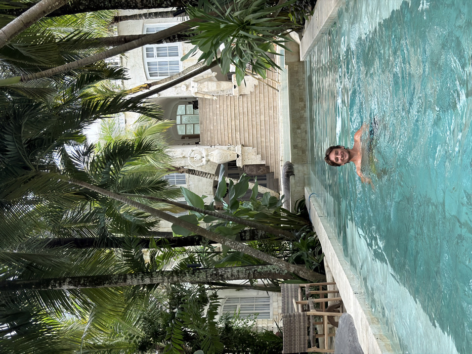 A man swims in a turquoise pool near a building with light-colored stairs and windows. Palm trees surround the scene. A table with chairs sits poolside, partially obscured by greenery. The building has ornate architectural details, including statues. The image orientation is sideways.