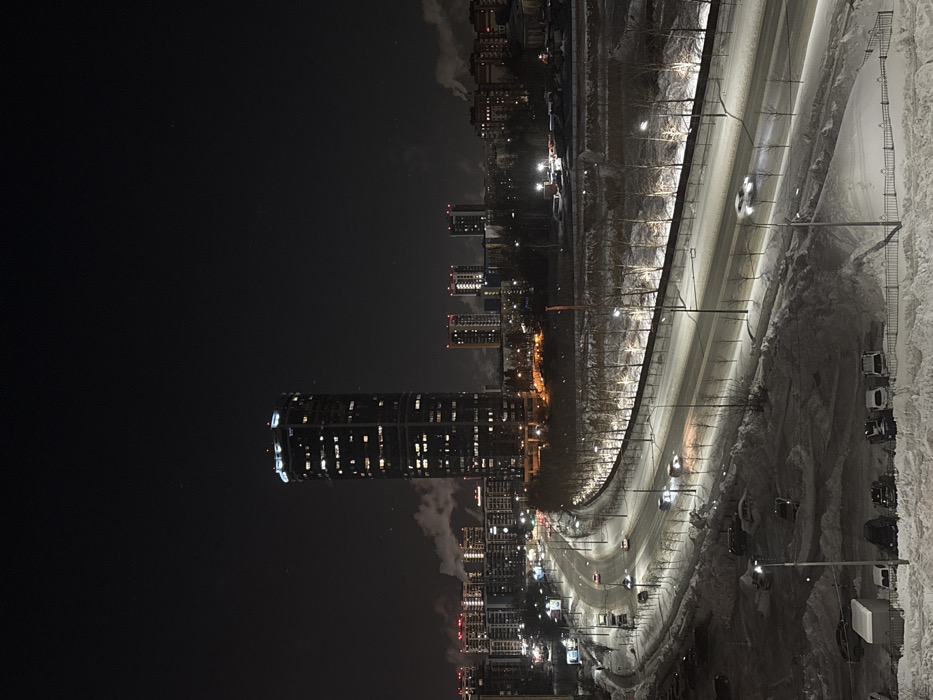 An elevated night view showcases a winter cityscape alongside a winding road. A tall, cylindrical building with numerous illuminated windows dominates the horizon. Adjacent to the building are other high-rise structures, their lights contributing to the urban glow. A road curves through the scene, illuminated by streetlights and the headlights of passing vehicles. Snow blankets the landscape, accentuating the contrast between the dark night and the bright artificial lights. Parked vehicles line the snow-covered roadside.