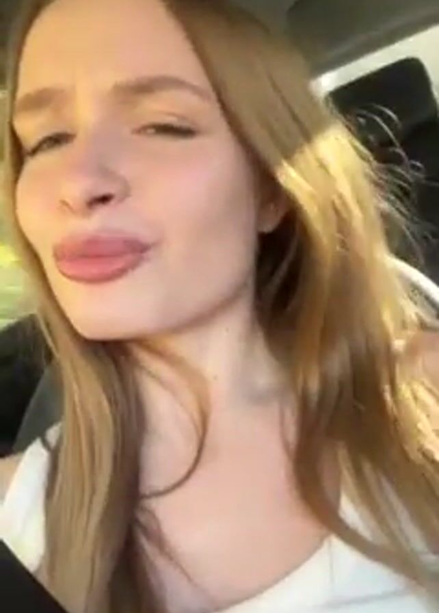 A fair-skinned woman with light brown hair sits in the driver's seat of a car. She wears a white tank top and a seatbelt is visible. The camera is close to her face as she looks towards the passenger side. She appears to be talking or singing along to music playing in the car. Through the car window, green foliage and bright sunlight are visible. The car's interior is a light color. The woman opens her mouth wide while talking.