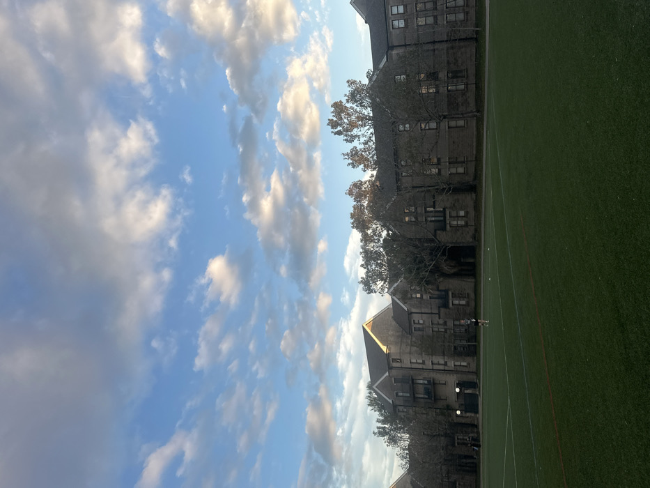 A low-angle view shows a college campus. A building with dark gray siding and many windows runs along the right side. In front of the building is a bright green athletic field. The sky is blue, with fluffy white clouds covering much of the frame. A few trees are visible between the building and the sky.
